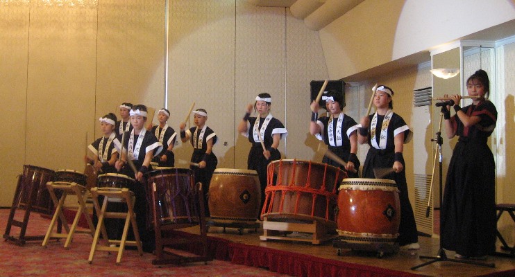 | 2007/02/17 結婚式を盛り上げました。 いつもお世話になっている小前さん岩木さんの結婚披露宴で、 打吹童子ばやしの子ども達 八犬士組による「新・八犬伝→宴 UTAGE」結婚式バージョンの演奏でお祝いしました。 倉吉シティホテル 4時から結婚式(人前式)に参列。 4時20分から、幸せなお二人の前で、 お二人と臨席の皆さんの未来に幸多かれと思いを込めて演奏しました。 お母さんたちも太鼓の撤収スタッフとして会場入りし、一緒にお祝いしました。 |