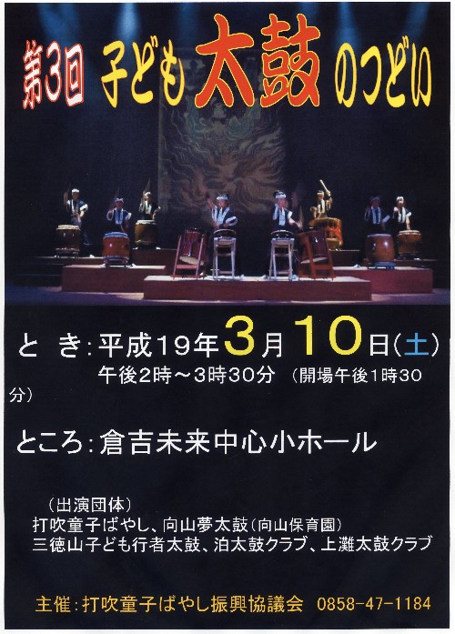 | 2007/03/10 満員御礼☆子ども太鼓のつどい たくさんの方にご来場いただき、無事に子ども太鼓のつどいを終了することができました。 ありがとうございました。 総出演者84人、出演団体5 打吹童子ばやし、向山夢太鼓(向山保育園)さん、三徳山子ども行者太鼓さん、泊太鼓クラブさん、上灘太鼓クラブさん 来年は、3月8日(土)です。 |
