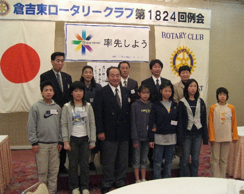 | 2007/03/15 倉吉東ロータリークラブより表彰されました。 打吹童子ばやしの活動が、小中学生で社会奉仕する青少年団体として、 倉吉東ロータリークラブの例会に於いて表彰されました。 |