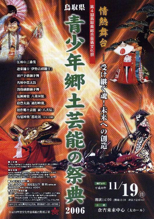 | 2006/11/17 いよいよ明日18日中部青少年郷土芸能フェスティバルです。 明日18日 午前10時より公開リハーサルです。 本番は午後1時30分からです。 初めて、中部の4団体が集います。 楽しみです。 子ども達も楽しみにしています。たくさんのお客様に来ていただきたいです。 打吹童子ばやしは、『疾風』『打吹童子ばやし〜天女と童子の物語』を演奏します。 フィナーレは出演者全員で『彩〜KODOより〜』を演奏舞います。