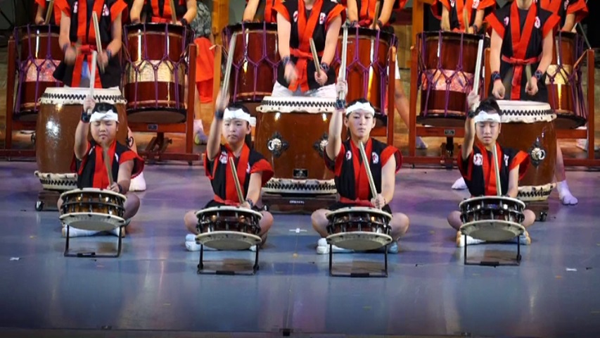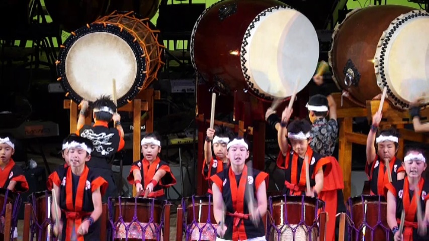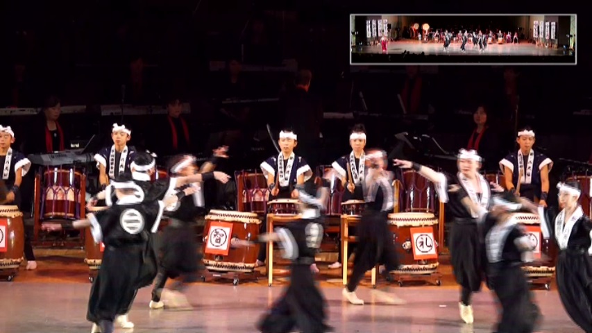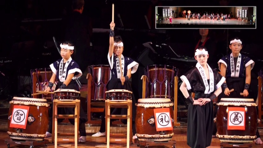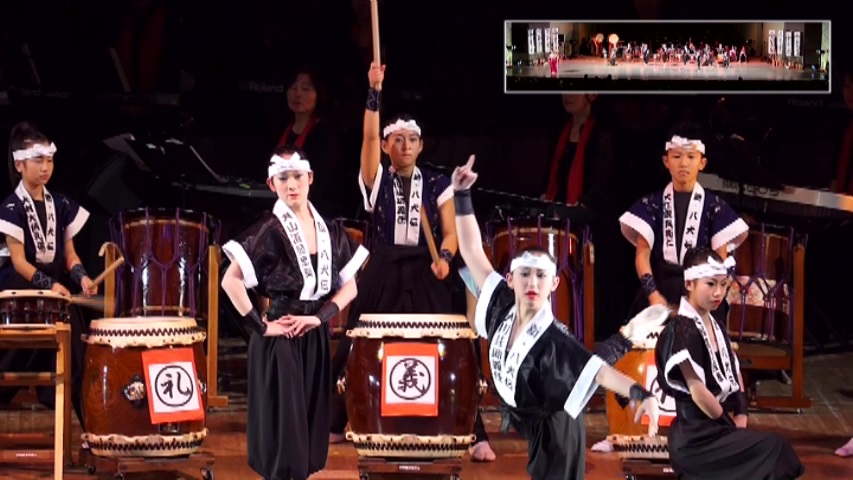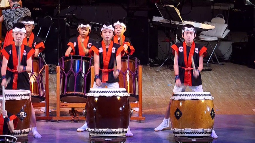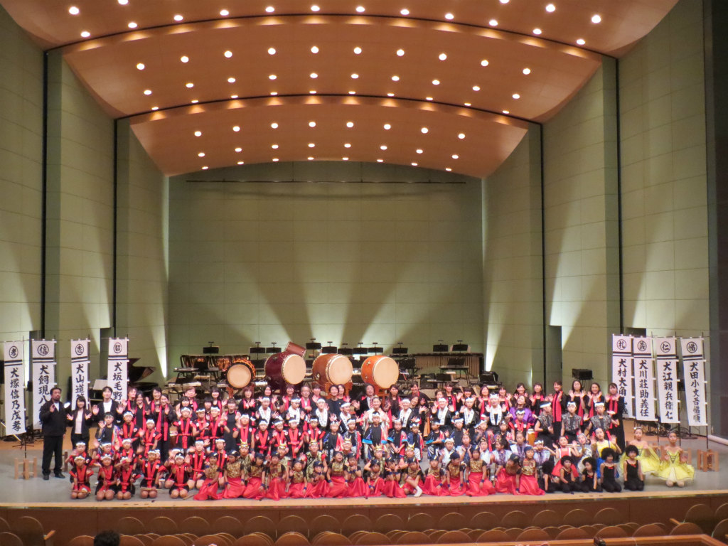 開場10分前(15:20)出演者全員で成功に向けて気持ちを一つにして「えいえい!おー!」 その後、大急ぎで集合写真です。(余裕♪余裕♪)ゲネを2回もさせていただきましたから。 (15:30) 予定通りの開場です。早い人は朝8時に並ばれたそうです。ありがたいことです。 (16:05) 5分押しでの開演になりました。 まずは、打吹童子ばやしによる「鼓魂2013組曲」の演奏です。 締め太鼓6人衆による「鼓魂」の演奏です。 |