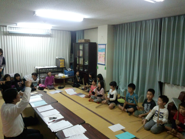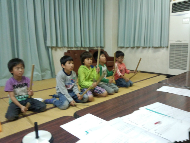 | 2013/11/01 選抜者補習練習会 また仲間が増えました。 一日あけて、選抜者補習練習会を夕方6時から7時半まで、向山保育園の会議室で行いました。 今回、初めて補習練習会に参加した人は、7人です。 3年生のりおさん、あいかさん、なつくん、みずきさん(しの笛) 1年生のりのんさん、そらくん、けんしんくん 全員で、17人が参加しました。 やる気のある人、練習を一生懸命頑張っている人、頑張る姿が育ってきた人の中から選抜で練習会をしました。 最初に、長谷寺の絵馬伝説のドンドコ楽譜を渡して説明をしました。 では、全員でリズム打ちをしてみましょう。 次に、歌の部分を繰り返し練習しました。 練習の途中で、「なんでかな!それは雑音ですよ。」「こうやって練習が止まることが、残念なのです。今は、一生懸命に曲を覚える、演奏方法をマスターするを頑張るときですよ。」「それができる人が今日は呼ばれて来ているのですけど。」 「・・・たった1人の適切でない行動で練習の時間が止まってしまうのです。」 みんなの意識が変化しました。 初めての参加なのに、どんどん上達していきましたよ。 レギュラーの2年生たいかくん、あやかさんも参加してくれました。 遅れて、3年生のみこさんが来ました。桶胴太鼓リーダー5年生のはやてくんも来てくれたので、一緒に練習をしました。 「長谷寺の絵馬伝説」2章・3章を繰り返し練習をしました。 みんなが上達しました。 次の練習日が楽しみですね。実戦でかっこいい演奏を楽しみにしていますよ。 あと、補習練習会に参加していないメンバーは、太鼓グループ6人 しの笛グループ3人です。 次々、補習練習会を計画してみます。 11月11日(月)は、しの笛グループの補習練習会を予定しています。 |