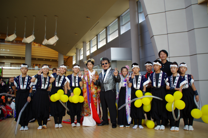 | 2013/10/06 MALTAさんからサプライズ!です。 しばしの休憩の後、いよいよフィナーレに突入です。 菜の花をあしらったバルーンアートを手にステージに向かいます。出演団体すべてがステージに揃ってフィナーレスタートです。 MALTAさんの名曲「HIGH PRESSURE」に合わせて、ステージいっぱいの菜の花がゆれ、会場全体が手拍子に包まれます。 観客席も総立ち状態でボルテージは最高潮です!! 大興奮のフィナーレ終了後に、再びアトリウムに場所を移して観客の皆さんをお見送りです。大きな声で「ありがとうございました!!」 お客様から「よかったよ!!」「感動したよ!!」「こんなに小さい子どもたちが演奏しとったの?演奏しとると大きくみえてたわ」「踊り可愛かったよ〜」などと多くの声をかけていただきました♪ アトリウムでお客様をお見送りしていたら、忙しい中、童子ばやしの子ども達のためにMALTAさんが駆けつけてくださいました。 こんなことってないですよ。うれしいね。ありがとうございます。 MALTAさんのサプライズに保護者も興奮気味です(笑) 多くの童子ばやしメンバーに声をかけていただき、総勢44名の童子ばやしと記念撮影。八犬士&伏姫’sと一緒に記念撮影。 忙しいなか童子ばやしメンバーのために足を運んでいただいたMALTAさんに心より感謝いたします。子ども達にとっても本当に良い思い出ができました♪ 天女音楽祭終了後の懇親会にてMALTAさんより「打吹童子ばやしの演奏は、とっても良かったよ」と声をかけていただきました♪ また、他の出演団体の方やスタッフの方からも「太鼓で盛り上がったね〜」などと絶賛する声をかけていただきました。 MALTAさんを始め、参加された出演団体さん、音響さん、照明さん、舞台スタッフさん、実行委員会のみなさん、たくさんの人がかかわって、素晴らしい舞台にしていただき、その舞台に立たせていただいた事を心より感謝いたします。 「倉吉天女音楽祭」に出演した22期メンバー全員が大きく成長できたと思います。今回経験したことを糧に、レギュラーはさらなる高みを目指し、まだレギュラーになれていない子はレギュラーになれるように日々の練習を頑張っていきましょう!! |
