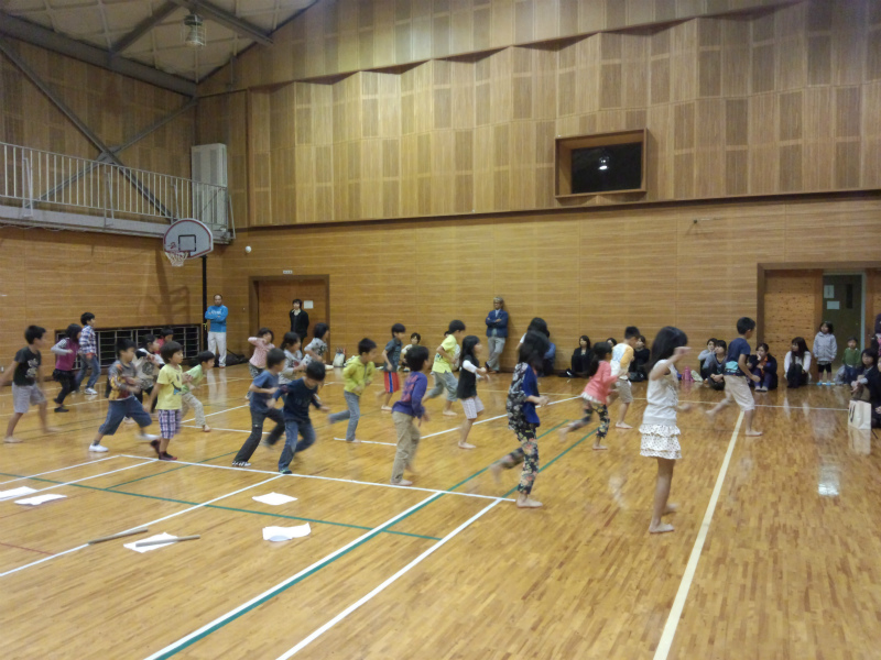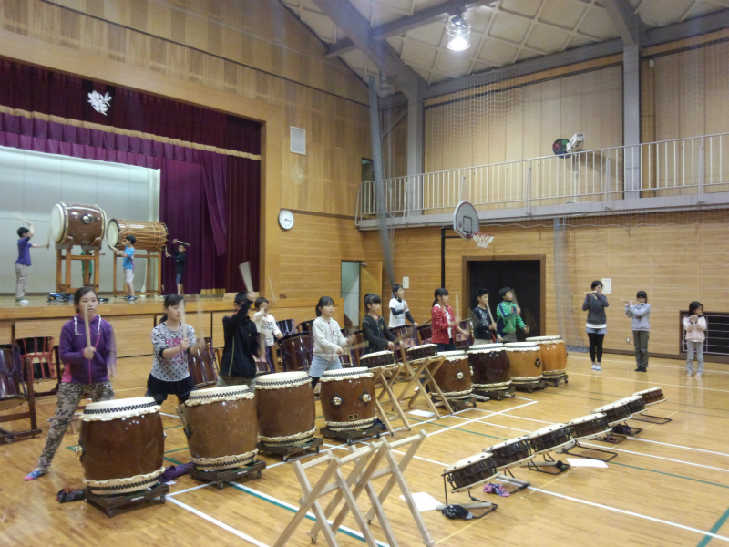 | 2013/10/09 定例練習会 凄く集中した練習ができました。 大舞台を踏んで、みんなの頑張る姿勢がぐぐと変わりましたよ。 まず最初に、「倉吉天女音楽祭では、みんなが頑張りましたね。」 「さて、これから目指すところを確認します。鼓魂2013を11月10日には鳥取県和太鼓連盟の演奏会で演奏します。11月17日はとりアートのオープニングで演奏します。流れを言います。@鼓魂締め太鼓バージョン Aオーライ!やぐらソロ B長谷寺の絵馬伝説2章3章 CMATSURI羽衣しの笛ソロ D祭囃子 やぐらソロ、宮太鼓揃い打ち、桶胴太鼓揃い打ち、宮太鼓揃い打ち、全員揃い打ち の流れで演奏します。それぞれの曲の選抜試合の候補生を発表します。重複しますが、頑張ってください。」 「宴の踊りは、大太鼓を打つようにドン♪斜めの太鼓を打つようにドン♪・・・・・・。」踊りのポイントを確認しました。 早速、宴の演奏と踊りをしました。みんな切れ味抜群の踊りを見せてくれました。素晴らしい。 長谷寺の絵馬伝説2章を練習しました。 グループに分かれて、6年生が指導に入りました。 桶胴グループは、打てるレギュラーが手本になって練習しました。 最後には全員で2章、3章を通して打ってみました。 なんとなく選抜メンバーはついてきています。がんばれ〜。 最後に、「鼓魂」締め太鼓バージョンを演奏してみました。 鼓魂の選抜候補生以外は、AパートとBパートに分かれて演奏を聴きました。 終わりのミーティングで、頑張る目標を確認しました。 「先生は、しばらく薄情者になります。やる気のない人はおいていきます。間違えても一生懸命に覚えよう、上手になりたいという人とどんどん先へ練習を進めていきます。レギュラーといえども、6年生といえども頑張れない人は、関係なく選抜試合から落としていきます。頑張ったメンバーでステージに上がりたいと思います。いいですね。みんな、がんばってくださいね。今日練習したことは、必ずお家で復習、練習をしてくださいね。」 お家からも頑張っている人に、音無しくんマットを貸し出しました。