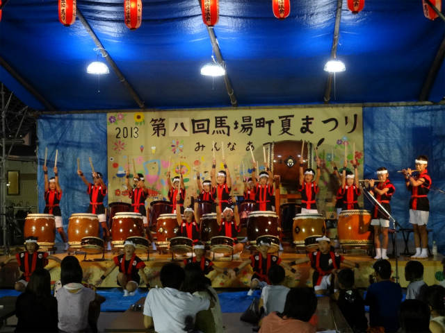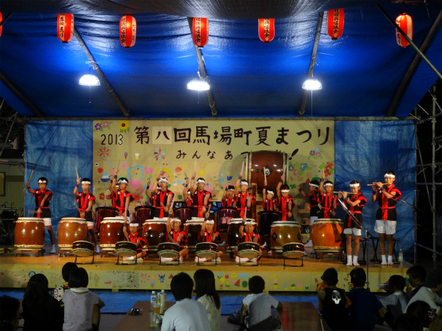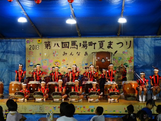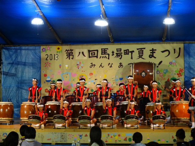 | 2013/08/17 馬場町夏祭りでパワフルな演奏を披露しました。 いいですねえ!いいですねえ♪ 観る人聴く人を圧倒するような演奏でした。(拍手)素晴らしい! 演奏はまだ少々荒いですが、勢いのある演奏に感動します。 打吹童子ばやし3章での宮太鼓の揃い打ちではゾクッとするような太鼓の響きがありました。 かっこいいというか素晴らしい! 22期もとってもいいチームになってきました。 夕方7時20分、馬場町夏祭りの大トリで登場です。 「MATSURI」(4分)→「打吹童子ばやし」(14分)→「うたげ」(3分) アンコールで「童子01」(3分)を演奏しました。 しの笛リーダーの山根みゆさん(6年生)が地元の祭りで太鼓デビューしました。(拍手)打吹童子ばやしで宮太鼓を演奏しました。 打吹童子ばやしでは、末兼わかなさん(4年生)が、しの笛を一人で吹ききりました。綺麗な澄んだ笛の音がとても心地良かったです。素晴らしい♪ 9月1日の里見まつりでは、伏姫デビューしますよ。 今後の練習課題もはっきりしてきました。 |
