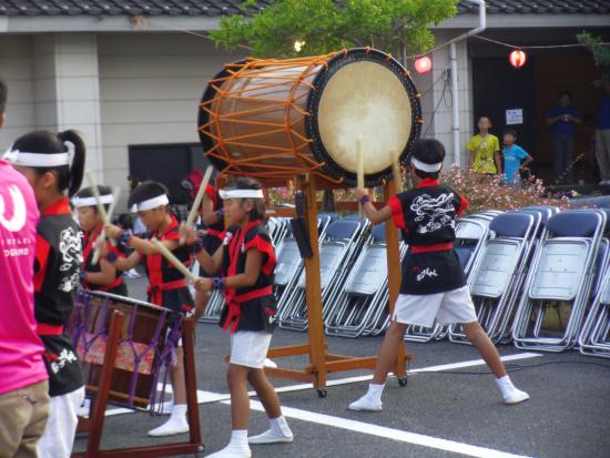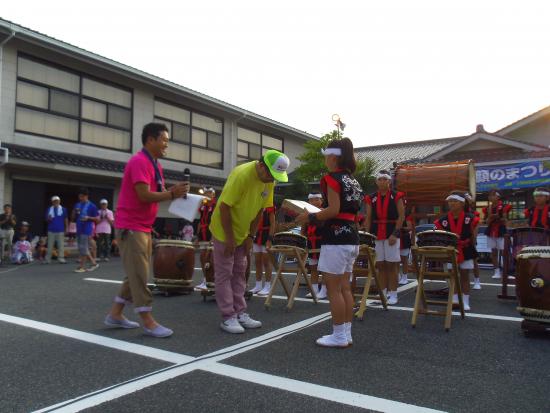 | 2013/07/27 おがも笑顔のまつりに友情出演 「おがも笑顔のまつり」でなかなかの演奏ですよ。 打吹童子ばやしが練習会場にさせていただいているさんさんプラザの駐車場で開催された「おがも笑顔のまつり」に友情出演しました。 開演午後6時にあわせて祭りのプロローグ「ふれ太鼓」として、午後5時30分より打吹童子ばやしが演奏しました。 友情出演で小鴨地区の皆様に子ども達の元気と笑顔をプレゼントしました。 学校の行事等で吉田リーダーと上灘小の5年生2名、成徳小の4年生1名、家の都合で4年生2名と2年生1名 7名欠席です。 主力が結構かけての22期の公式戦初演奏になりました。 打吹童子ばやしに入団しての年数が平均3年くらいの初々しいメンバーのデビュー演奏になりました。 吉田リーダーが休みだったので、今日は、副リーダの門脇ゆいさんがリーダを代行して、チームをまとめてくれました。 門脇ゆいさんは、すごくまっすぐに取り組んでくれるので、先生はとっても安心して、任せられます。 6年生もとっても協力的です。 さすが、1年生から入団して最終年いろいろなことを経験、体験して、みんながリーダーシップとチームワークを理解して率先して行動できるように成長しました。 そのことが、とっても嬉しいです。 「おがも笑顔のまつり」で演奏したメンバー (締め太鼓) 谷口まお(6年生) 秋月みこ(3年生) 磯江あやか(2年生) (宮太鼓) 門脇ゆい(6年生) 山根りょう(4年生) 石坂りく(4年生) (桶胴太鼓) 秋月はやて(5年生) 坂井たかほ(5年生) 大番たいか(2年生) 福田みずき(2年生) (やぐら) 林らいや(6年生) 古林くうた(5年生) (篠笛) 山根みゆ(6年生) 演奏曲:MATSURI(5分)→打吹童子ばやし「天女と童子の物語」(12分) 打吹童子ばやし3章では、合宿でいっぱい練習したので、とっても躍動感のある演奏をしました。 宮太鼓1のソロ→やぐら太鼓ソロ→桶胴太鼓ソロ→宮太鼓2ソロ→全員揃い打ち!! かっこいい! 最後もばっちり決まりましたよ。 演奏中に「かっこいい!」「すごい!」「うまいなあ!」たくさんのお褒めの言葉をいただきました。 演奏後は、3回も紹介されました。ありがとうございます。 紹介される度に、子ども達はちゃんと一礼ができていました。拍手です。 太鼓を片づけて、打吹天女伝説まつりの会場(銀座商店街)に移動です。 |