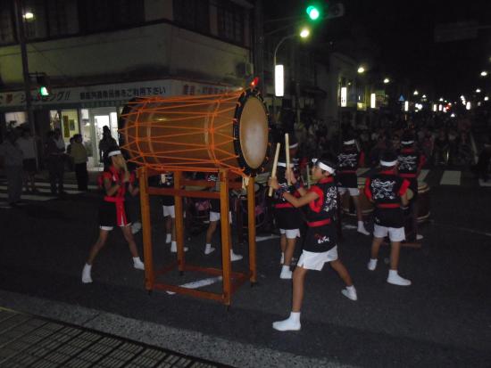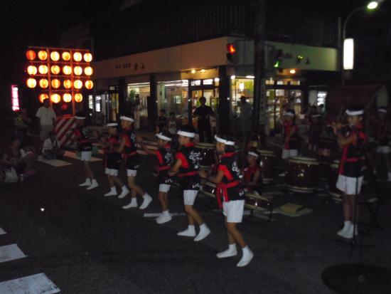 | 2013/07/27 打吹天女伝説まつりで粋のいい演奏をしました 打吹天女伝説まつり 午後7時30分から銀座商店街 明治町交差点で演奏しました。 米田けんしんくん(4年生)と山根ななさん(4年生)が合流です。 午後6時から歩行者天国になって、成徳小学校と明倫小学校合同チームの金管バンドが東西南北にパレードです。 団員のななちゃん(4年生)の頑張っている姿を応援しました。 続いては、成徳小学校全生徒による「みつぼし踊り」です。 ゆったりと祭りが進行していきます。白壁土蔵並みでは「光の回廊」が同時開催されていました。 「7時40分より打吹童子ばやしのみなさんによる和太鼓の演奏があります。どうぞお集まりください。」 会場アナウンスが銀座通りのスピーカーから流れると、たくさんの打吹童子ばやしファンのみなさんが集まってこられました。 明治町交差点に太鼓を移動して、お客様の前でセッティングをして、曲のフォーメーションを確認して、早速演奏開始です。 地声で「みなさんこんばんは。打吹童子ばやしです。打吹童子ばやしは、打吹山に伝わる天女と童子の伝説を子ども達、童子の奏でる笛太鼓で伝承していこうと1992年に誕生した子ども太鼓連です。 打吹天女伝説まつりは、打吹童子ばやし誕生の翌年1993年に第1回目が始まりました。以来、打吹童子ばやしはレギュラーとして出演させていただいています。 打吹童子ばやしは今年で22年目の活動になります。 今日デビューする子もたくさんいます。 今日は、MATSURI、打吹童子ばやし「天女と童子の物語、うたげを演奏します。どうぞ聞いてください。」 だんだんだだん♪「わっしょいわっしょい♪」 らいやくんのやぐら太鼓の音が勇ましく響きます。気合十分です。 掛け声もとっても元気です。 1曲目のMATSURIの演奏も最後はばっちり決まりました。 「みなさんこんばんは。打吹童子ばやしです。次に演奏しますのは、打吹童子ばやし 天女と童子の物語です。」 リーダー代行の門脇ゆいさんの清々しい声がお客様に届きました。 2曲目の打吹童子ばやしプロローグでは、 気合が入りすぎて、新レギュラーくん達は、猛スピードなテンポで打ちまいた。経験十分のレギュラーはそこは冷静に演奏しました。(今後の練習目標ができました。) 3章での、宮太鼓グループの演奏は圧巻です。 気持ちが前のめりで、とっても威勢よくかっこ良かったです。 今日は、【達人】門脇ゆいさん(6年生)1人と4年生男子3人と4年生女子1人 5人で揃い打ちをしました。 みんながノリノリの演奏をしました。 私も祭りのりで一生懸命掛け声を出しました。「いいぞ〜!」 「それそれそれそれ〜♪」 ストリートライブならではのノリです。 子ども達もお客様も楽しそうです。 全員揃い打ちでは、ますますノリノリの演奏です。 「わたしは、この子らの演奏が大好きだに。いつも応援してますよ。今日も元気をもらったよ。ありがとう。」 お客様から演奏中に、涙ぐんで声をかけられました。 ありがたいことです。 3曲目は、新・八犬伝より「うたげ」です。 打吹童子ばやしが終わると間髪入れずに、山根みゆさんのしの笛が入りました。 やあ〜♪ライブですねえ。 踊りは、りょうくん、けんしんくん、たいかくん、なみこちゃん、あやかちゃん、みずきちゃん です。 あらら、うたげの演奏者が少なくなっちゃいました。 ・・・演奏できるメンバーが少ないことに気づきました。・・・今後の練習課題ですね。 和やかな雰囲気で自然に手拍子が湧いて、最後もばっちり決まりましたね。 時間があるので、ライブ感覚で団員紹介をしました。 最年少2年生組から順に一人ずつ紹介しました。なかなかないですが、これからもあってもいいのかな。 交差点で演奏なんてなかなかできない経験をしましたね。 来週の祭りのストリートライブのリハーサルに十分なりました。 「打吹天女伝説まつり」出演者 (締め太鼓) 谷口まお(6年生) 山根なな(4年生) 秋月みこ(3年生) 磯江あやか(2年生) (宮太鼓) 門脇ゆい(6年生) 米田けんしん(4年生) 山根りょう(4年生) 石坂りく(4年生) 山根なな(4年生) (桶胴太鼓) 秋月はやて(5年生) 坂井たかほ(5年生) 大番たいか(2年生) 福田みずき(2年生) (やぐら) 林らいや(6年生) 古林くうた(5年生) (篠笛) 山根みゆ(6年生) MATSURI(5分)→打吹童子ばやし(12分)→うたげ(3分) みんなで集合写真を撮った後、控室でミーティングです。 まずは、副リーダーから今日の演奏の講評です。 つづいて、6年生のまおさん、みゆさん、らいやくんが講評しました。 「練習をもっと真剣にやろう。」みんなの共通したコメントです。 いつも本番に向けての意識を持って練習すること、いい加減に感覚で練習しているから、いざ本番で勝手な演奏をしてしまうのです。 まだまだ、100点の演奏ができないのだから、まずは100点の演奏ができるレギュラーになってください。 その次は120点レギュラーですよ。 今日の演奏は75点です。でもみんなの気合は120点です。すごい!(拍手♪) 気持ちの入った、
