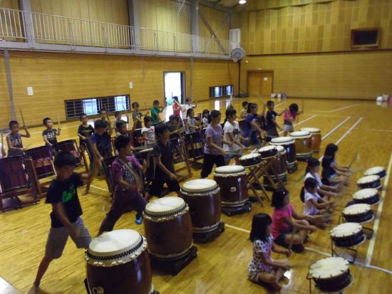 | 2013/08/07 定例練習会 決まり良く、気持ちの入った練習ができました。 打吹まつりお疲れ様でした。と〜ても楽しかったね。 今日は、とっても蒸し暑かったですね。風の通るところに太鼓をセットして練習をしました。 今日からは、全員が打吹童子ばやしの並びで練習です。 まずは、「童子01」をレギュラーも一緒に演奏をしました。・・・かっこいい!☆☆! 合宿でレギュラーになったメンバーにレギュラーの印しを渡しました。「レギュラノーの印しは重たいよ。しっかり練習しようね。」 見学者があったので、もう一度「童子01」を全員で演奏しました。 次に、全員で打吹童子ばやしのプロローグ→1章を練習しました。 1章の終わりを解説しながら練習です。・・・すごいなあ!01の子ども達もついてこれるようになっていました。ピタッと決まりました。 1章の締め太鼓のソロから終わりまでを通してみました。いい感じで決まりましたよ。 基本打ちをしました。しっかりと腕を振り上げて打ち込む!早いリズムもしっかりと腕を振る! 続いて2章です。どんどんどんどん♪どんどこどこどん♪どこどん♪どこどん♪どんどこどこどん♪ 続けて3章も演奏しました。 今日の練習は、これで終了です。 最後に、ミーティングです。 11日は、レギュラーとレギュラー候補生の練習会です。14日の定例練習会はお盆でお休みです。17日は、馬場町の夏祭りでレギュラーが出演します。 ワッショイワッショイ!6年生5人と先生の音頭でワッショイコールです。いい声が響いています。 リーダー「これで太鼓の練習を終わります。ありがとうございました。」「ありがとうございました。」 今日から新団員が1名増えました。灘手小学校3年生のナツくんが入団です。 |