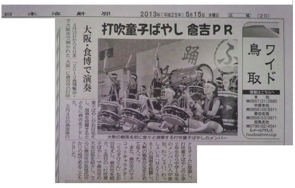 | 2013/05/15 日本海新聞「鳥取ワイド」に掲載されました。 5月15日付けの日本海新聞「ワイド鳥取」のコーナーに、 「'13食博覧会・大阪 The International Food Expo UTAGE 2013 IN OSAKA」(4月26日〜5月6日)の倉吉市PRタイム(5月4日)に出演した時の打吹童子ばやしの記事が掲載されました♪ うれしいですね。これを励みに22期も突っ走りますよ。 |