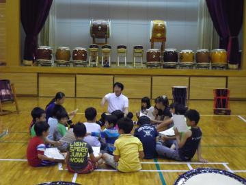 | 2013/06/01 特別練習会をしました。 夏に向けて、午後1時から5時まで特別練習会をしました。 しの笛グループは、研修室で特別練習をしました。 太鼓チームは、体育館で、新曲:練習曲「童子01」(どうじゼロワン)を練習しました。 01は、本当は4循環ですが、今日は2循環で終わりの演奏です。時間は1分30秒です。 が、本気モード全開で打つと、汗びっしょりで意気が上がります。 打吹童子ばやしの流れるような演奏ではなく、スタンッ!と打ちます。思いっきり打ち込みます。 音の振動の幅が違います。 いつもの演奏が5の幅だとしたら、10の幅くらいあるかんじで、打つというよりぶっ叩くくらいの意識のほうが分かりやすいでしょうか。 譜面を見ながら、説明。みんなで音読をして、ひざ打ちをして・・・。 いよいよ、太鼓を打ってみました。 最初は、ゆっくり演奏しました。徐々に、スピードを上げて演奏してみました。 山根りょうくんの打ち方がかっこいいです。センターで打ってもらいました。 レギュラーは体育館に残って、打吹童子ばやし、長谷寺の絵馬伝説、鼓魂、オーライ!、ばえん祭 を通して演奏しました。 2年生と新団員は、ロビーで譜面を見ながら練習しました。 グループごとに、テストをしました。 もう一度、体育館に合流して、全員で練習をしました。 レギュラーには、「01」の手本になる演奏ができるように練習してもらいました。 レギュラー選抜 @チーム、Aチーム、Bチーム で模範演奏をしてもらいました。 全員で演奏しました。 最後に、全員で「MATSURI」→「日本のまつり」を演奏しました。 選抜メンバーによる「童子01」模範演奏を全員で、聴きました。みんなは膝打ちをしました。 保護者のみなさんも真剣に聞きました。 どうしても演奏が一本調子になってしまうことと、力強さ、切れ味、太鼓の面白みを伝える演奏(表現力)までにはいきませんね。 単純な曲ほど面白みがあるし、結構体力使います。 みんなの今後の上達が楽しみです。 「童子01」は第22期が脱皮するための課題曲です 終わりのあいさつは、2年未満の団員とレギュラーメンバーが向かい合って整列して、 対面でワッショイコール対決をして、今日の練習を終わりました。 2年未満の団員チームは「01」(ゼロワン)に決まりました。 チーム01のリーダーは大番たいかくん、副リーダーは福田みずきさん、サブリーダーは遠藤はやとくん、木下こうきくん、磯江あやかさん、向井しおんくんです。 レギュラーチームは、新曲「童子 NO.8」から、ナンバーエイトです。 |