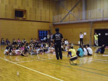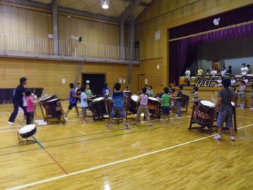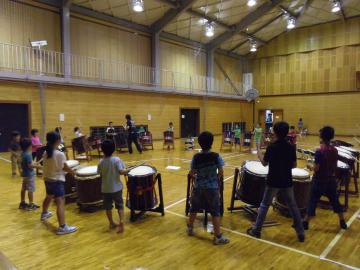 | 2013/05/29 定例練習j会 今日は、新団員のための新曲のリズムを繰り返し練習しました。 どんどこ どんどこ どこんこ どこんこ♪ 全員フロアに輪になって、繰り返し打ちました。表現を大きくなかなかできないね。 全身で打つ。体を小さく前傾で打ち込む。目線は下から・・・。 汗だくです。休憩は、自分のペースでとりながら、締め太鼓、宮太鼓、桶胴太鼓を移動しては打ちました。 段々良い音になってきました。 みんなの手本になるような、パフォーマンスと打ちができるようになったメンバーは、円の中心で打ちました。 最後に、MATSURIを全員で演奏しました。 総集編で、新曲のリズムをセンターで演奏したメンバーで、新団員、保護者の皆さんに聞いていただきました。 なかなか力強い曲でしょ! ワッショイコールを1〜5年生対6年生でやって、練習を終了しました。 これから暑くなります。熱中症対策をしましょう。 6月、7月の予定表を配りました。 6月1日(土)の午後から特別練習をします。
